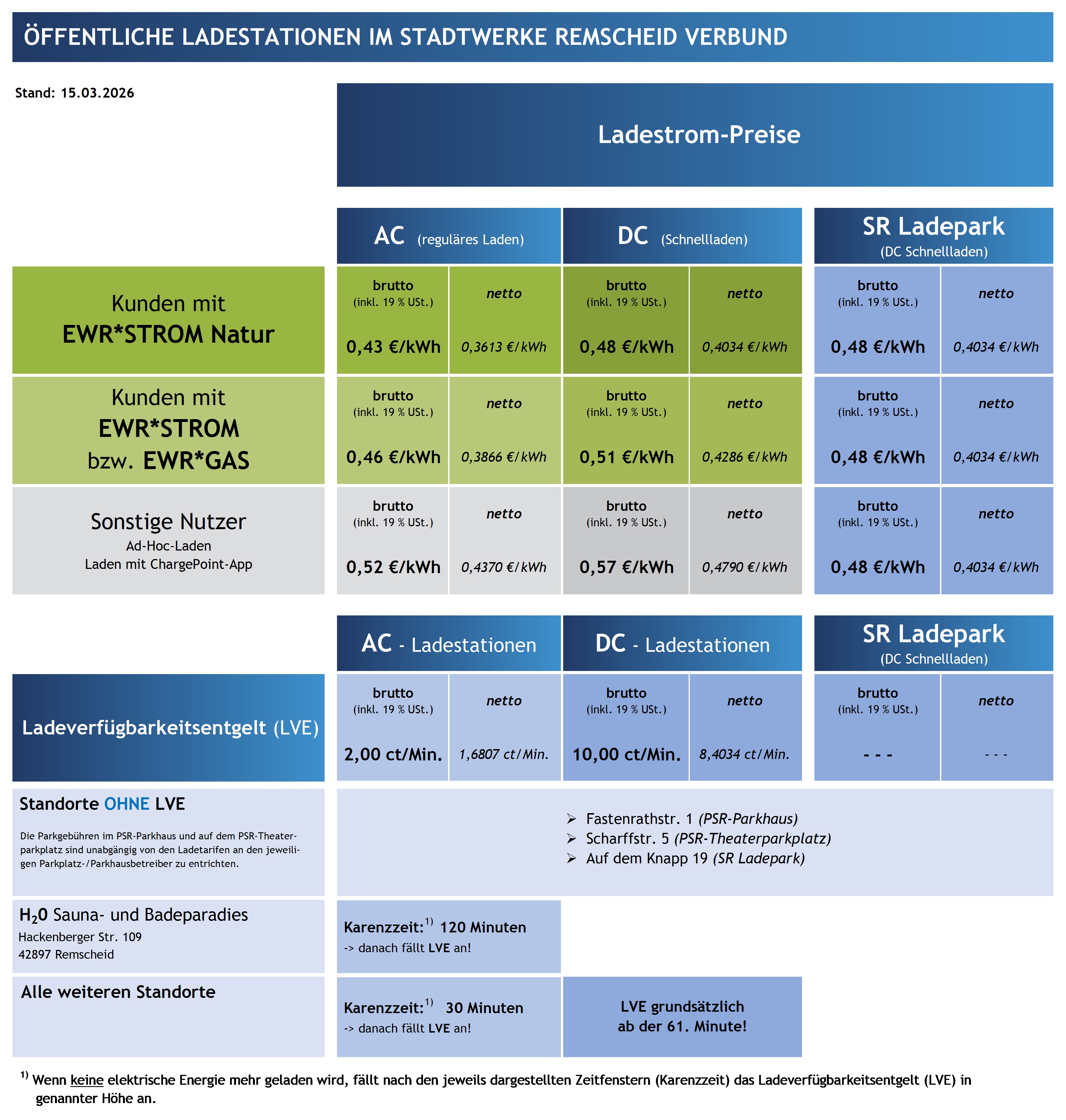 Neu sind auch die Ladeverfügbarkeitsentgelte (LVE). Wenn keine elektrische Energie mehr geladen wird, fällt nach einer Karenzzeit ein Ladeverfügbarkeitsentgelt an. Die Tarife dazu finden Sie direkt an der EWR*Ladestation, in der App oder unter der Reiterkarte ‚Tarife & Preise‘. Das LVE dient dazu, die Verfügbarkeit der Ladestationen für Ladevorgänge sicherzustellen und eine weitere Nutzung – des an sich nicht mehr ladetechnisch genutzten Stellplatzes – für weitere Fahrer/innen zu ermöglichen. So wird gewährleistet, dass die Ladesäule nicht als Dauerparkplatz genutzt wird und möglichst viele Kunden die Möglichkeit haben, ihr E-Auto zu laden.